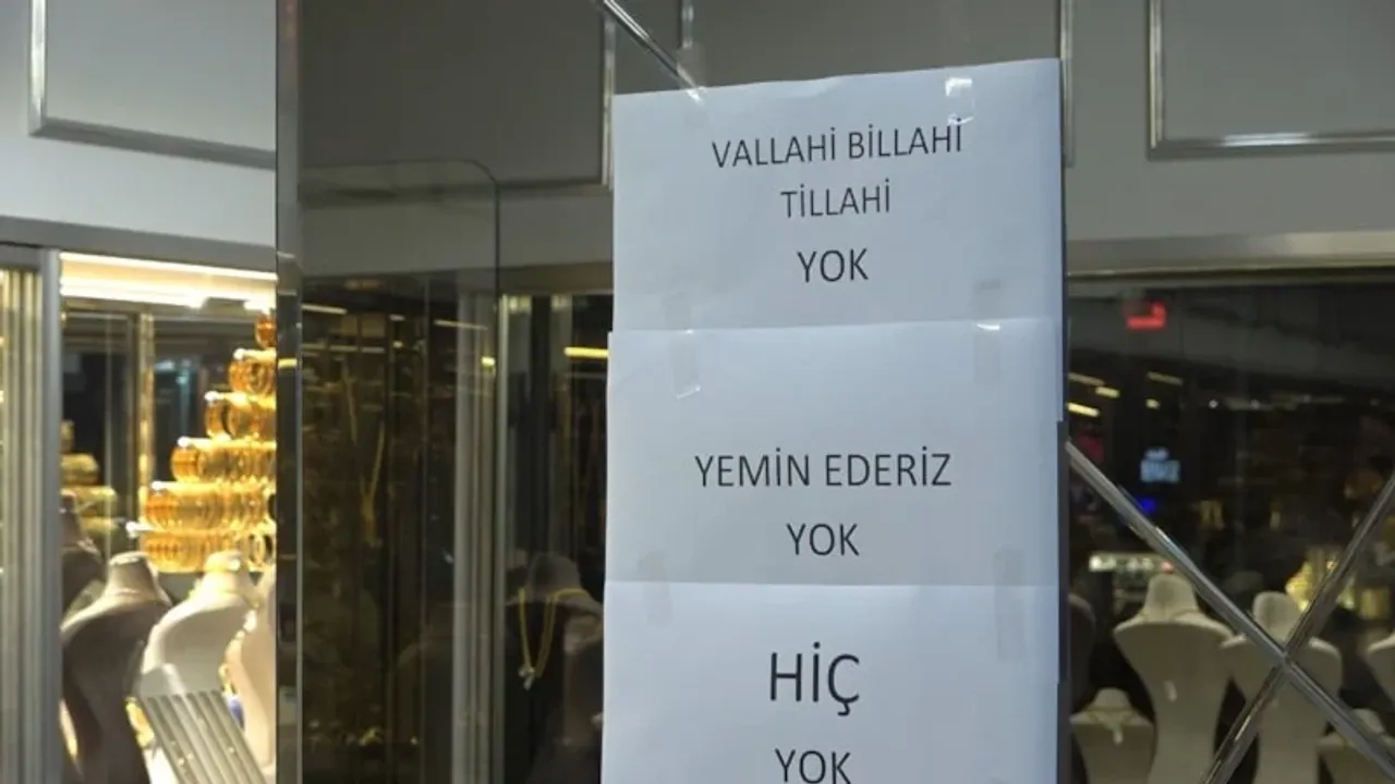 Bursa'nın Yıldırım ilçesi Erikli Mahallesi’nde yoğunluğun en çok yaşandığı adreslerden biri olan bir kuyumcu, altınların kısa sürede tükenmesi üzerine çareyi camına yazı asmakta buldu. “Vallahi billahi yok, yemin ederim yok” notuna rağmen vatandaşlar altın almakta ısrar etti.