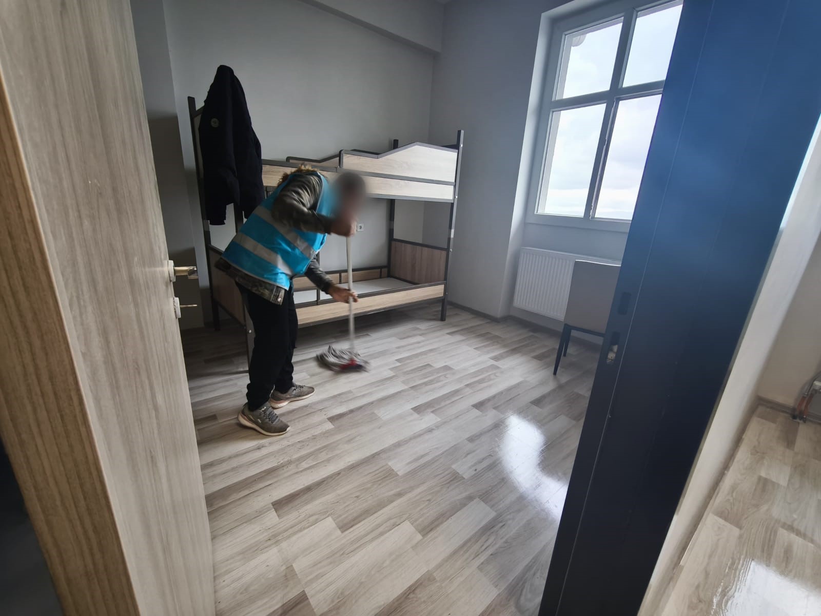 Toplam 9 katlı büyük yurt binasında 3 hafta boyunca her gün 25 kişilik yükümlü grubu görev aldı. Yükümlüler; 150 oda, 3 merdiven bölümü, 8 koridor, asansörler ve tüm ortak kullanım alanlarında inşaat sonrası detaylı temizlik yapıldı. Temizlik çalışmalarının ardından her odaya 6 adet sandalye, 1 adet komodin ve 1 adet buzdolabı yerleştirilerek taşıma işlemleri tamamlandı.