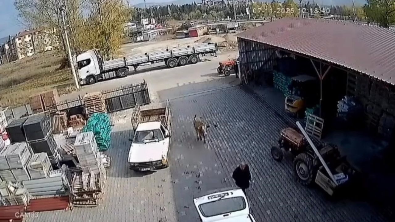 O anlar ise iş yerinin güvenlik kameralarına yansıdı. Görüntülerde, depoya giren ineğin yürüyen bir vatandaşa çarparak düşürdüğü görülüyor. Daha sonra üzerlerine koşan inekten çalışanlar son anda kurtuluyor. İnek daha sonra kendisini uzaklaştırmaya çalışan vatandaşın arkasından koşmaya başlıyor.