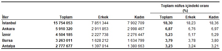 İstanbul'un nüfusu, bir önceki yıla göre 52 bin 451 kişi artarak 15 milyon 754 bin 53 kişi oldu. Türkiye nüfusunun yüzde 18,3'ünün ikamet ettiği İstanbul'u, 5 milyon 910 bin 320 kişi ile Ankara, 4 milyon 504 bin 185 kişi ile İzmir, 3 milyon 263 bin 11 kişi ile Bursa ve 2 milyon 777 bin 677 kişi ile Antalya izledi.